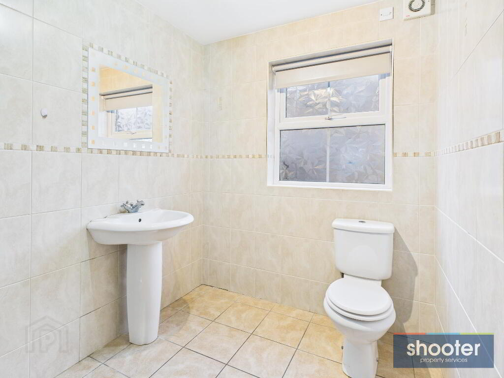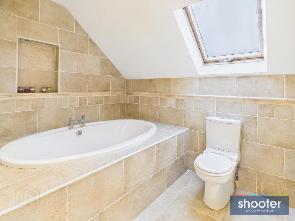 - Low flush toilet, tiled bath and hanging vanity unit with wash hand basin. Heated towel rail. Velux window and extractor fan. Fully tiled walls and floor.