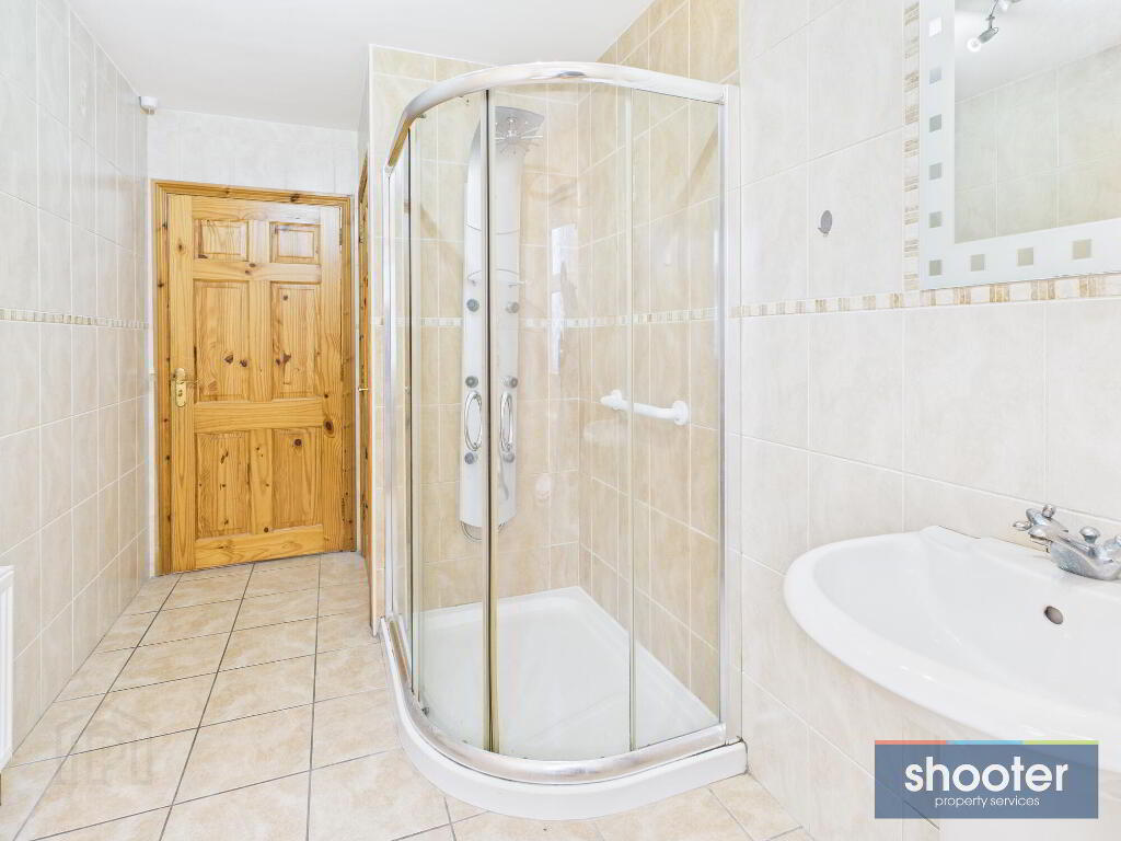 - Low flush toilet, pedestal wash hand basin and quad shower unit. Mirror and extractor fan. Fully tiled walls and floor. Hotpress off.