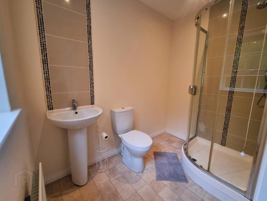 White suite comprising low flush WC, pedestal wash hand basin and shower cubicle with mixer shower, part tiled walls, extractor fan, radiator.