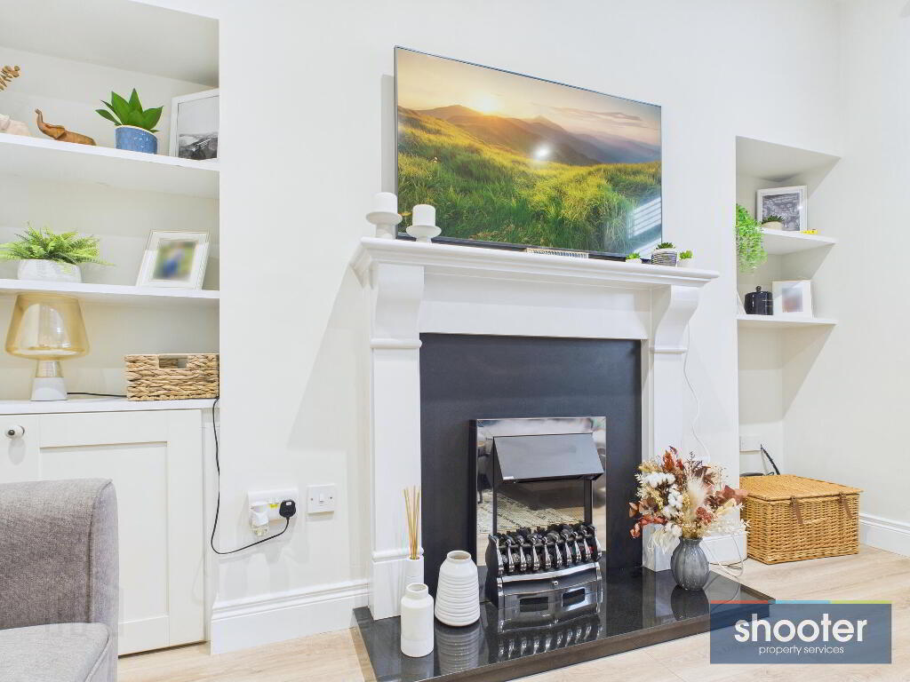 - Granite fireplace with tile hearth and electric inset. Built-in cupboard and shelving. Television point. Recessed ceiling lights and laminate floor.