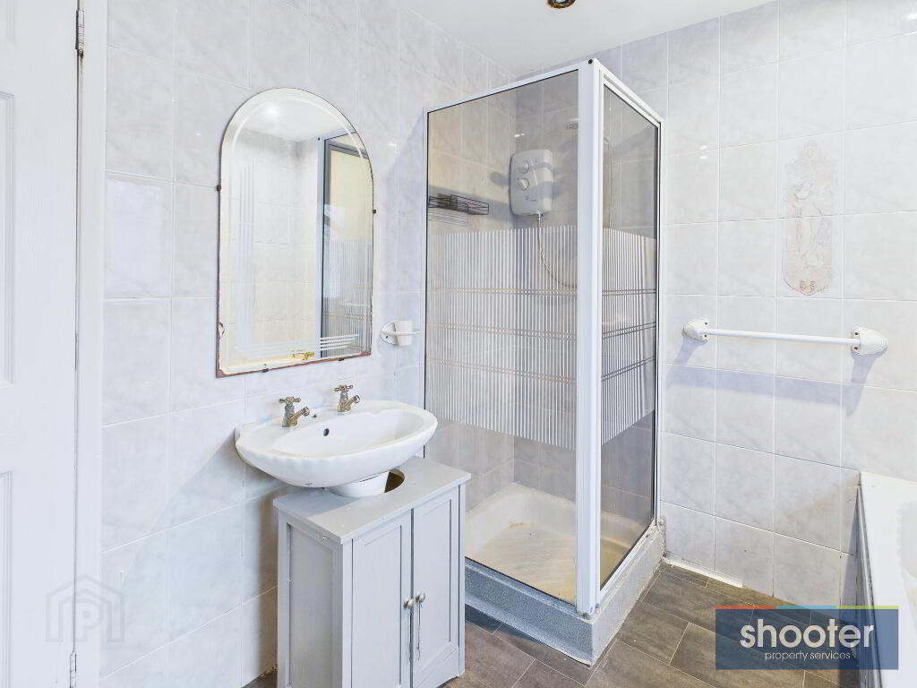 - Toilet, pedestal wash hand basin with vanity unit, bath and shower. Triton electric shower unit. Ceramic tiled walls and vinyl floor. Coved ceiling and recessed ceiling lights. Storage cupboard off with gas boiler.