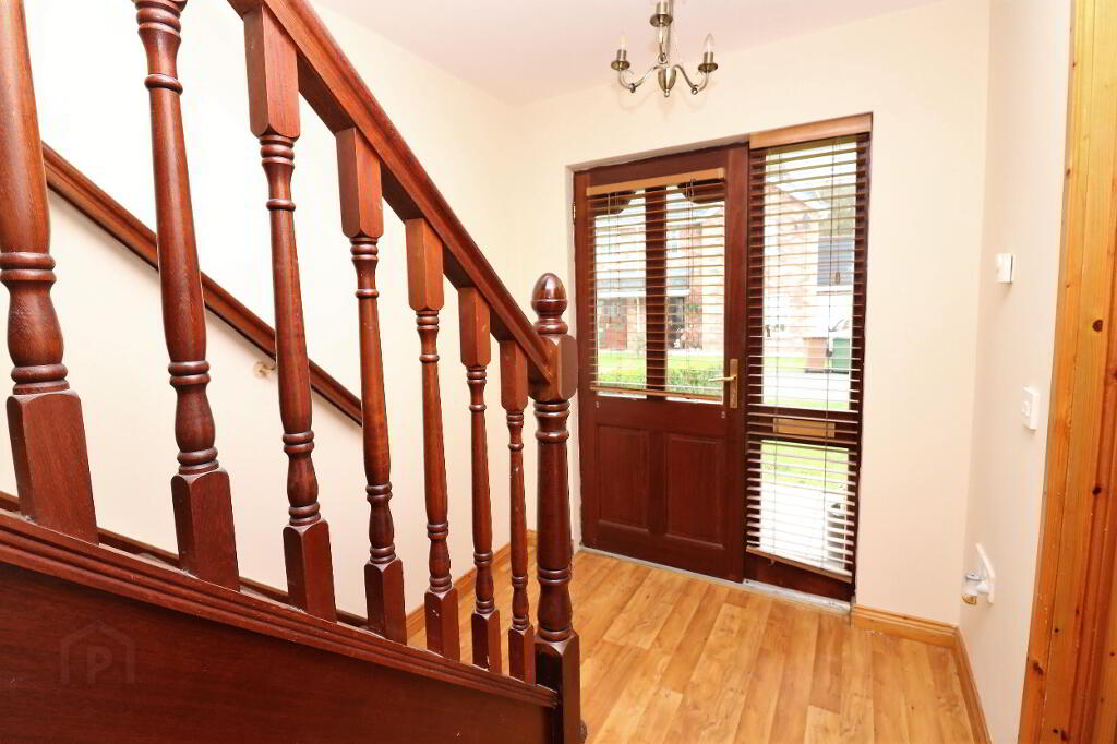 Hardwood double glazed front door and side screen, understairs storage cupboard with light, laminate wooden floor, telephone point, 1 radiator.