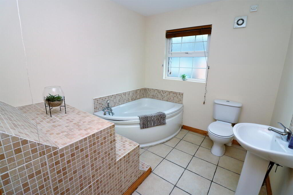 White suite comprising low flush WC, pedestal wash hand basin and corner bath with mixer tap telephone shower attachment, tiled walls, tiled floor, 1 radiator.