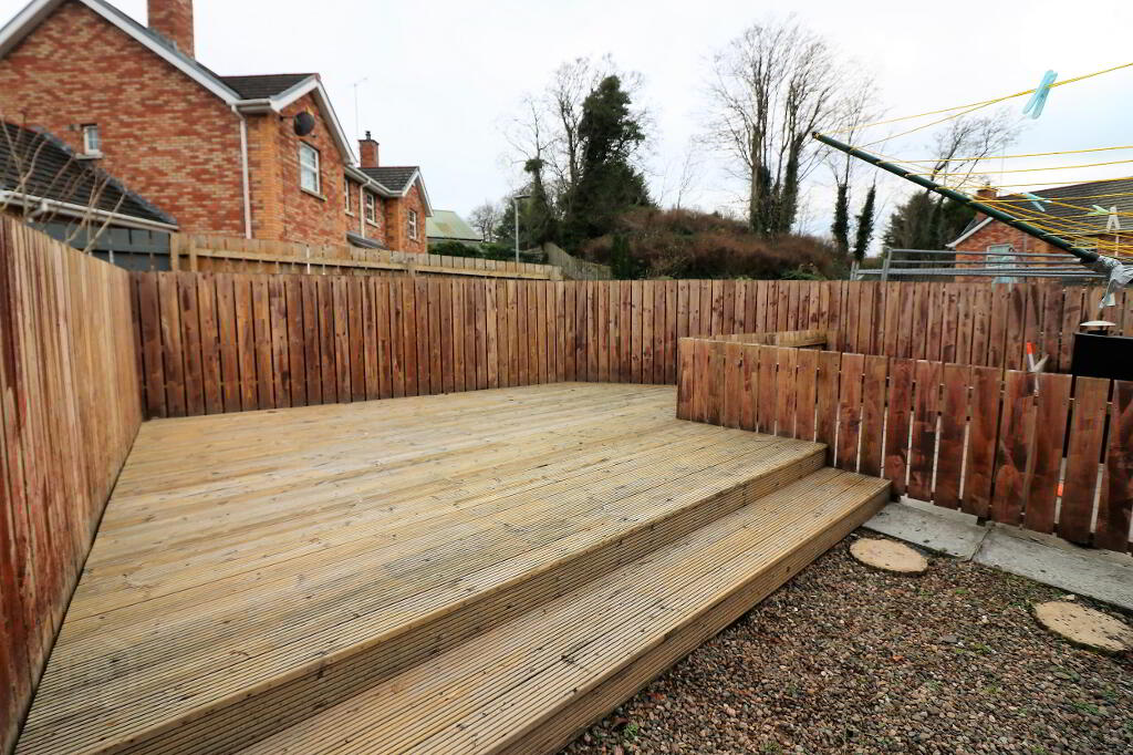 Neat front lawn with tarmac driveway to side. Fully enclosed rear garden with paved patio, feature large decking and pebbled areas. Outside lighting and water tap.