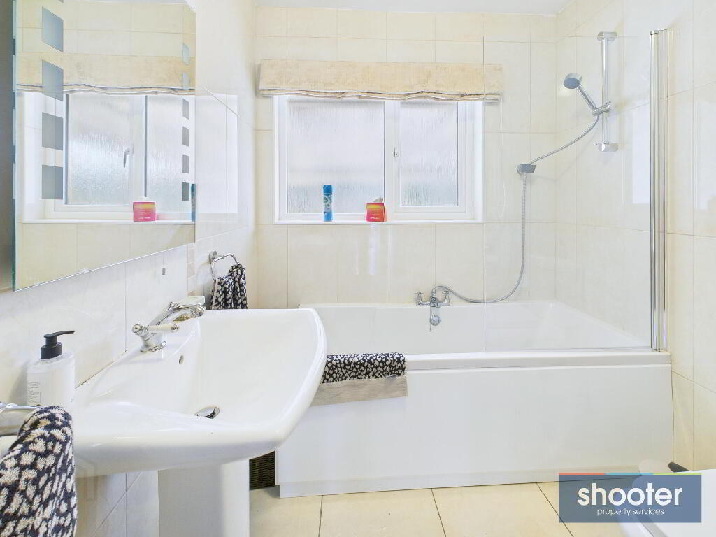 White bath with shower fitted over and shower screen. Toilet, pedestal wash hand basin and heated towel rail. High gloss ceramic tiled floor and walls. Fitted wall mirror, fittings and ceiling light.
