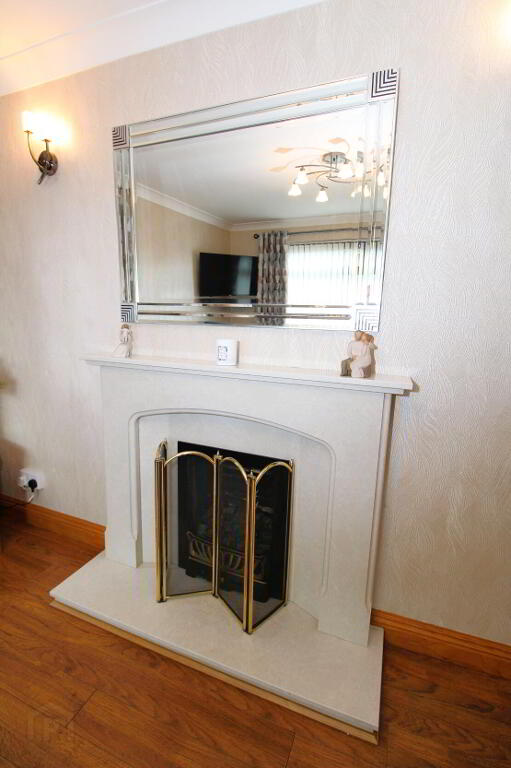 Feature granite fireplace with gas fire inset, laminate wooden floor, ceiling cornice, double panel radiator.