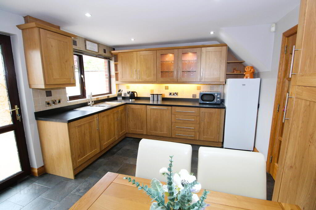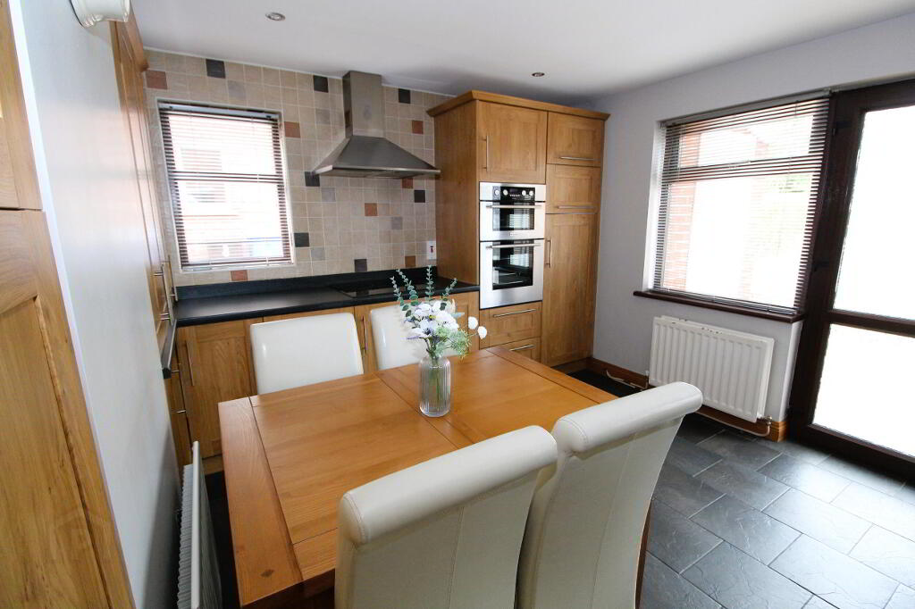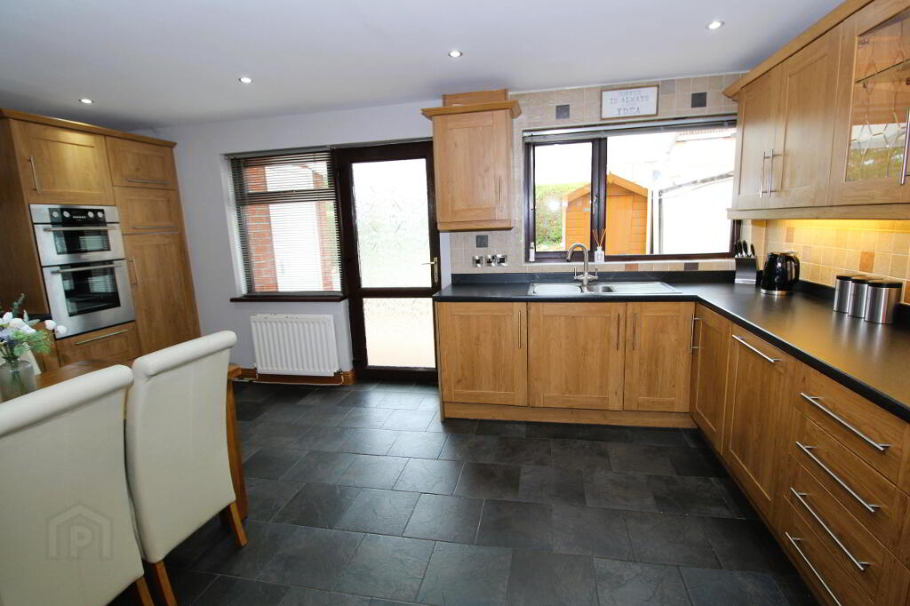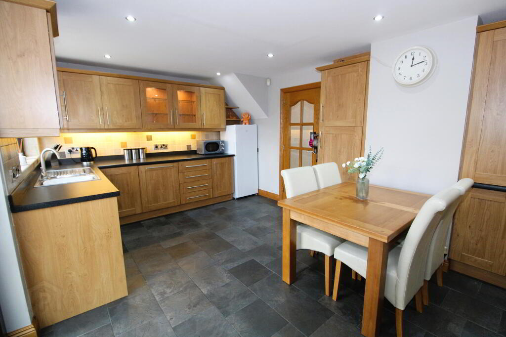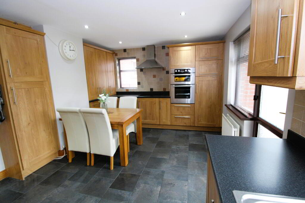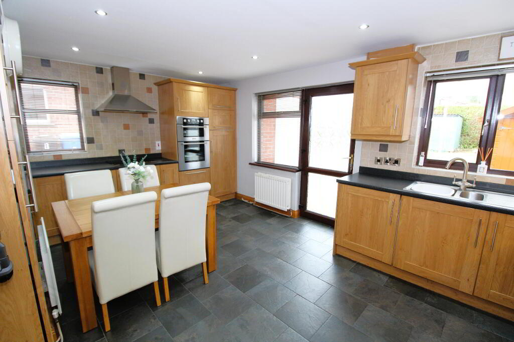 Excellent fitted kitchen with a wide range of high and low level units and complementary worksurfaces, 1 1/2 bowl stainless steel sink unit and mixer tap, Hotpoint double oven and 4 ring hob, stainless steel extractor fan, Bosch integrated fridge, freezer space, integrated washing machine, integrated dishwasher. Glazed display unit, part tiled walls, ceramic tiled floor, recessed lighting, uPVC rear door, double and single panel radiators.