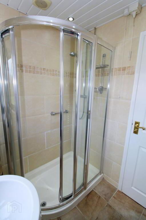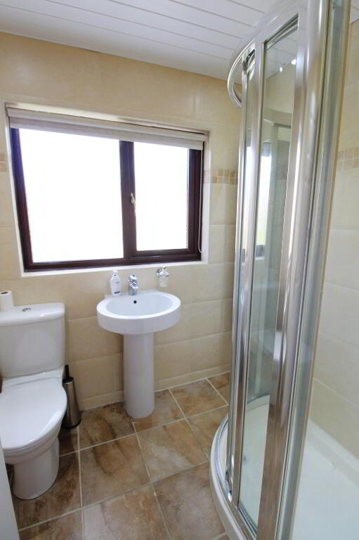 Modern white suite comprising low flush WC, pedestal wash hand basin and shower cubicle with mixer shower. Fully tiled walls, ceramic tiled floor, PVC ceiling with recessed lighting, chrome towel rail.