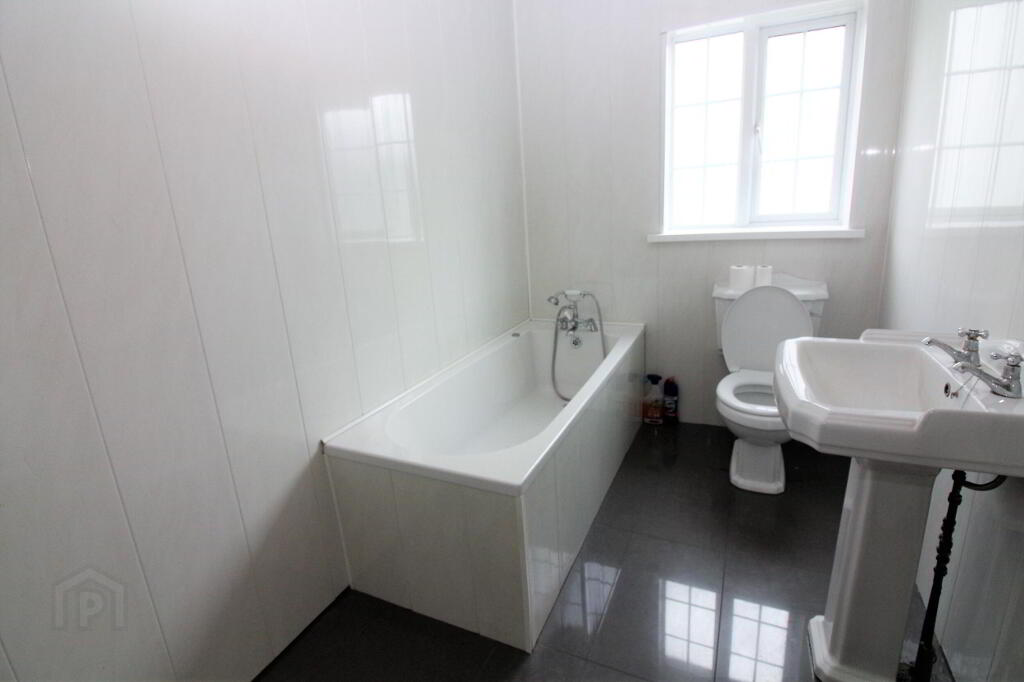 White bath with mixer taps over, toilet and wash hand basin. Ceramic tiling to floor and pvc cladding to walls. Extractor fan and pvc ceiling finish.
