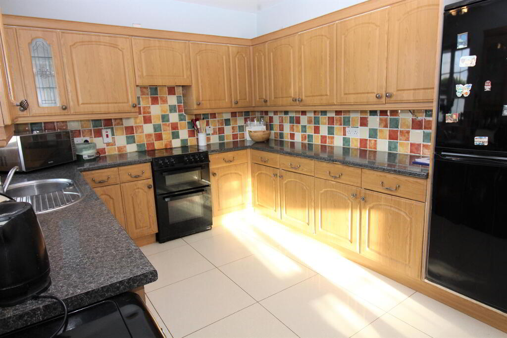 Modern range of high and low level units including cooker, fridgefreezer, dishwasher, washing machine and tumbledryer. Fully tiled floor and part tiled walls. Extractor fan. Door to dining room.
