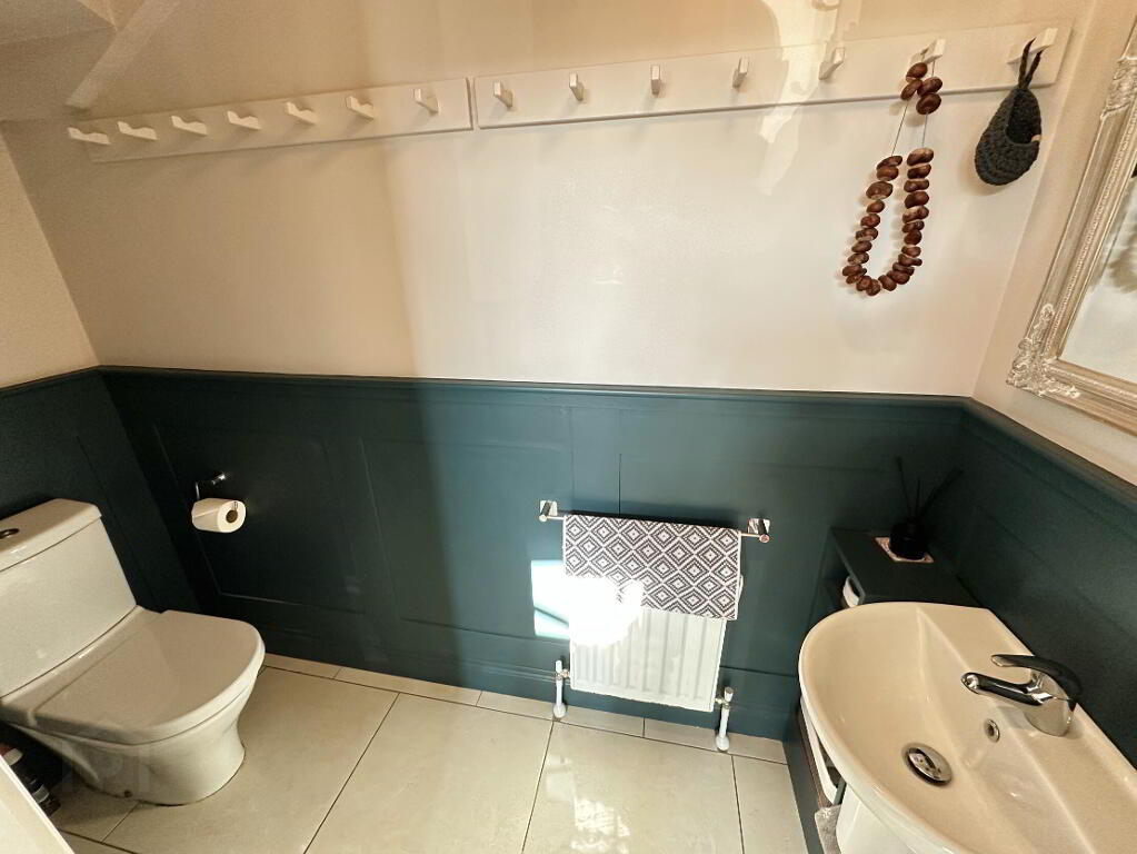 With low flush WC and wall mounted wash hand basin with mixer tap, tiled floor, wall panelling, radiator.