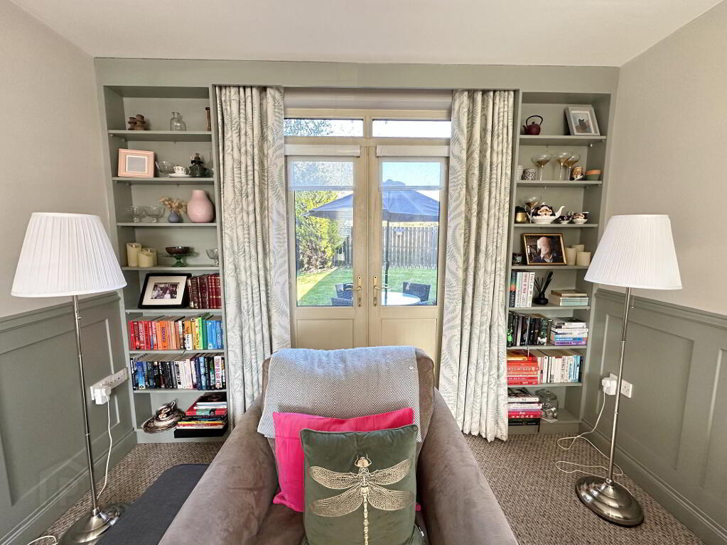 Feature wall panelling with bookcase surround to double glazed double doors leading to the garden, TV point, double radiator.