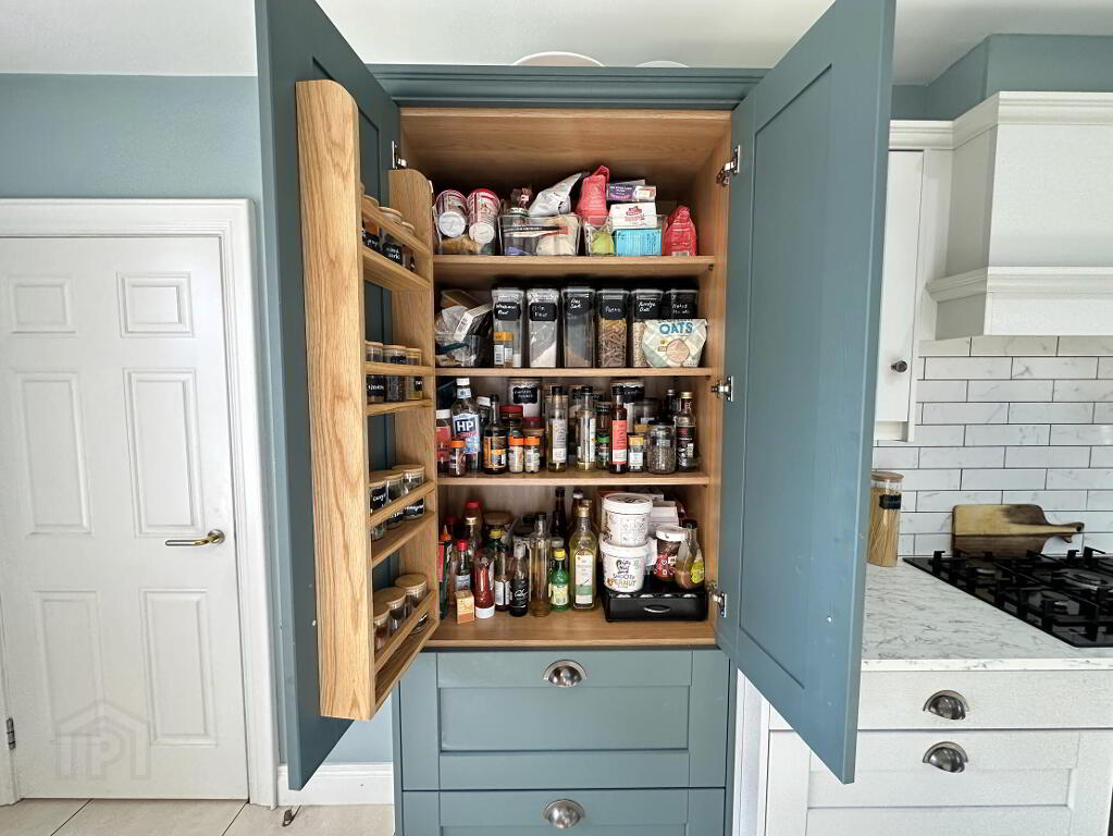 Superb range of wall to wall tall units incorporating integrated larder fridge and spaces for stacked tumble dryer and washing machine, tiled floor, PVC double glazed back door, double radiator.