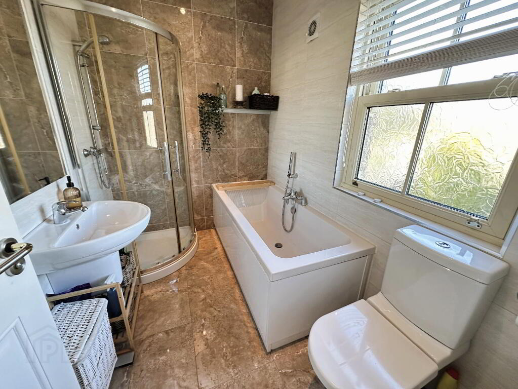 White suite comprising low flush WC, wall hung wash hand basin with mixer tap, panel bath with centre mixer tap shower attachment and quadrant shower cubicle with thermostatic mixer shower. Fully tiled walls and floor, recessed ceiling spots, double radiator.