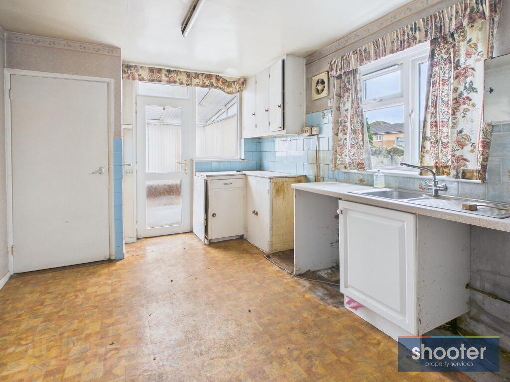 High and low level units incorporating stainless steel sink unit and space for cooker, washing machine, dishwasher and fridge-freezer. Extractor fan. Vinyl floor and part tiled walls. Storage cupboard off.