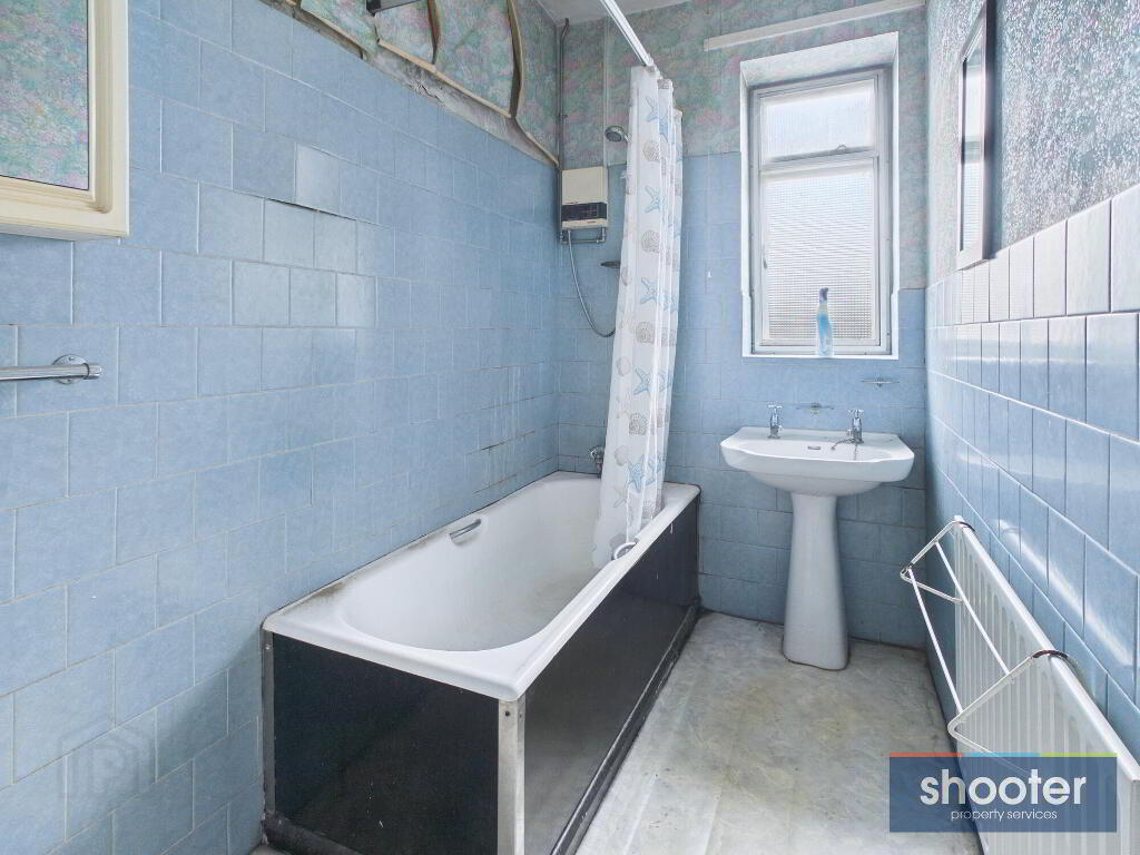 Pedestal wash hand basin, bath with electric shower unit, pole and curtain. Vanity unit and towel rail. Vinyl floor and part tiled walls. Hotpress off.