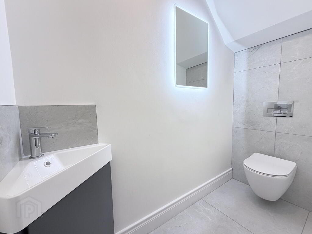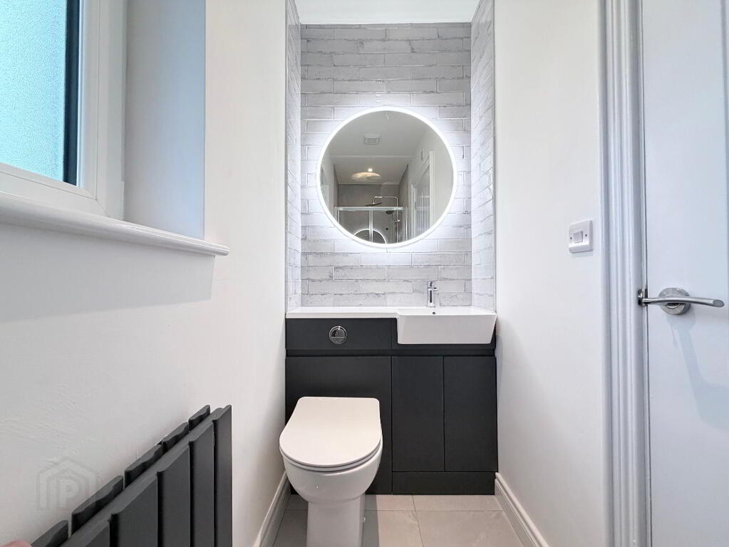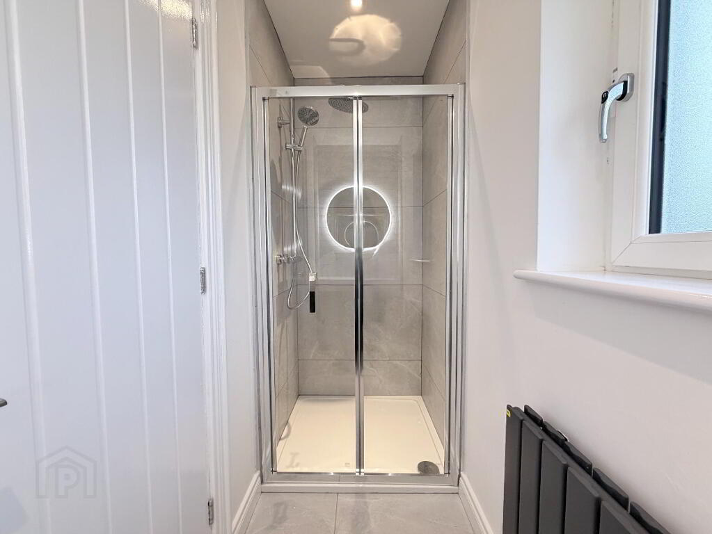 Basin vanity and back to wall WC unit, LED wall mirror and fully tiled shower enclosure with thermostatic mixer valve, handheld and fixed rain head attachments, feature anthracite radiator, recessed ceiling spots.