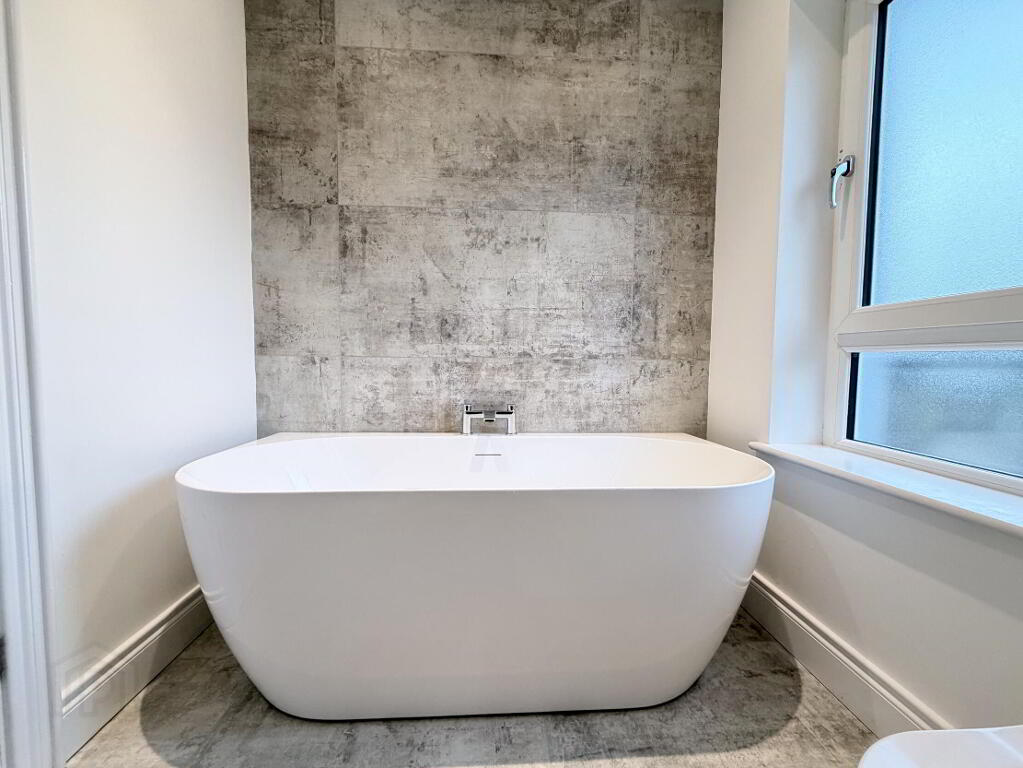 Luxury white suite comprising dual flush WC, wall mounted vanity unit with wash hand basin and mixer tap, LED mirror, feature bath with centre mixer tap and quadrant shower cubicle with thermostatic mixer valve, handheld and fixed rain head attachments. Part tiled walls, fully tiled floor, heated chrome towel rail, recessed ceiling spots.