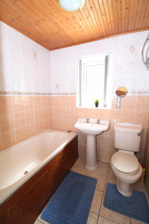 Coloured suite comprising low flush WC, pedestal wash hand basin and panel bath with mixer tap, fully tiled walls, ceramic tiled floor, 1 radiator.