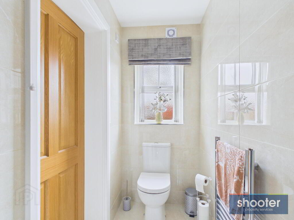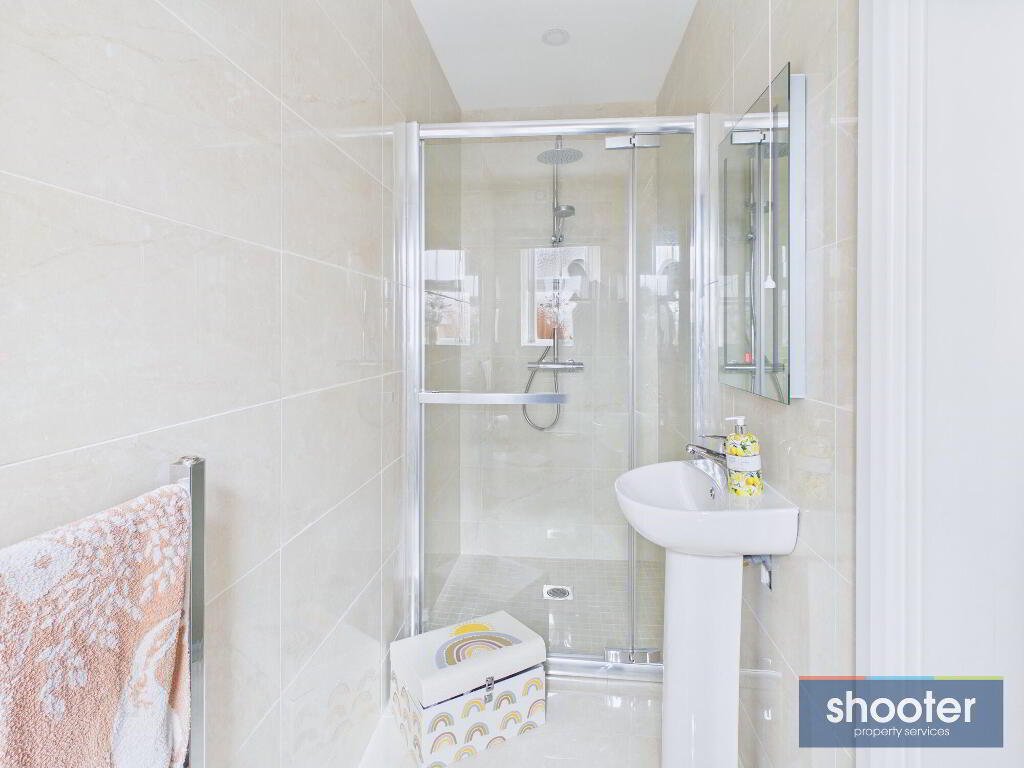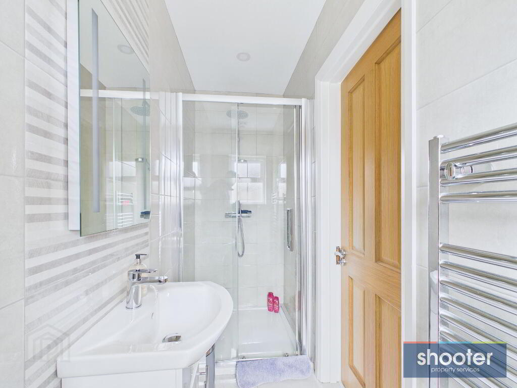 - Toilet, pedestal wash hand basin, LED mirror, heated towel rail and enclosed shower with slider door. Extractor fan. Ceramic tiled floor and walls.
