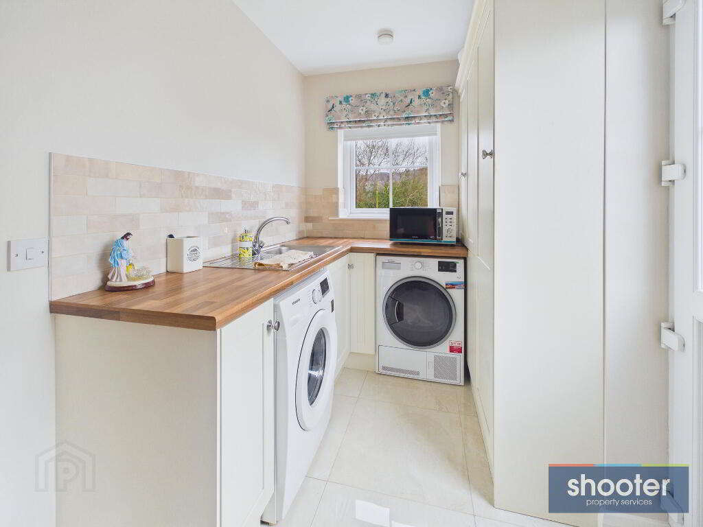 - High and low level units with stainless steel sink unit. Space for washing machine and tumble dryer. Ceramic tiled floor and part tiled walls. PVC door to rear.