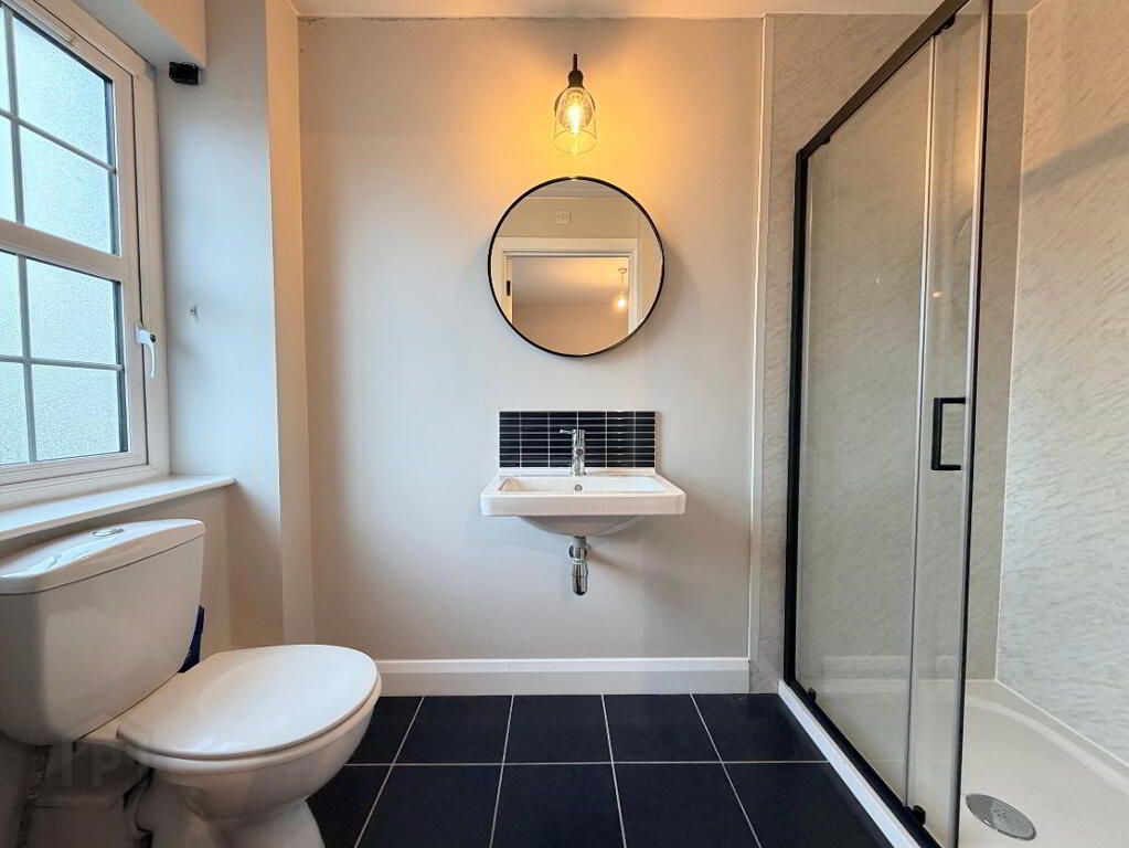 White suite comprising low flush WC, wall mounted wash hand basin with mixer tap and fully tiled double shower enclosure with thermostatic mixer shower, tiled floor, recessed ceiling spots, heated towel radiator.