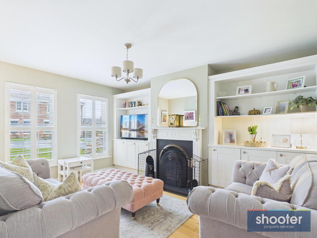 Open fireplace with slate hearth, wooden surround and mantle. Television aerial. Built-in recessed units with cabinets. Hardwood floor.