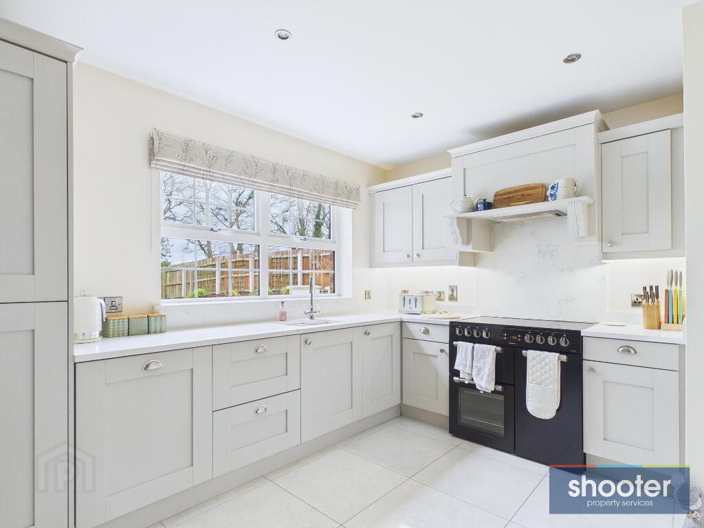 Modern range of high and low level units with quartz worktops incorporating ceramic sink unit, integrated dishwasher, fridge-freezer and Cookmaster electric range cooker. Recessed ceiling lights and ceramic tiled floor.