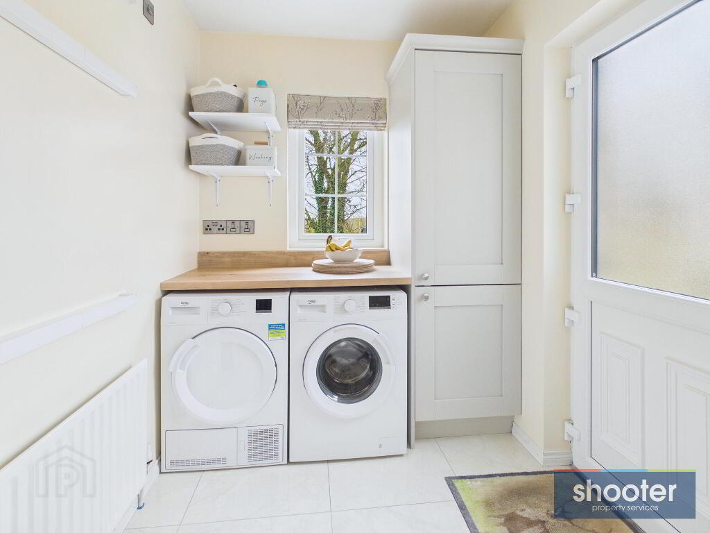 Built-in units with space for washing machine and tumble dryer. Coat hooks and shelving. Ceramic tiled floor. PVC door to rear.