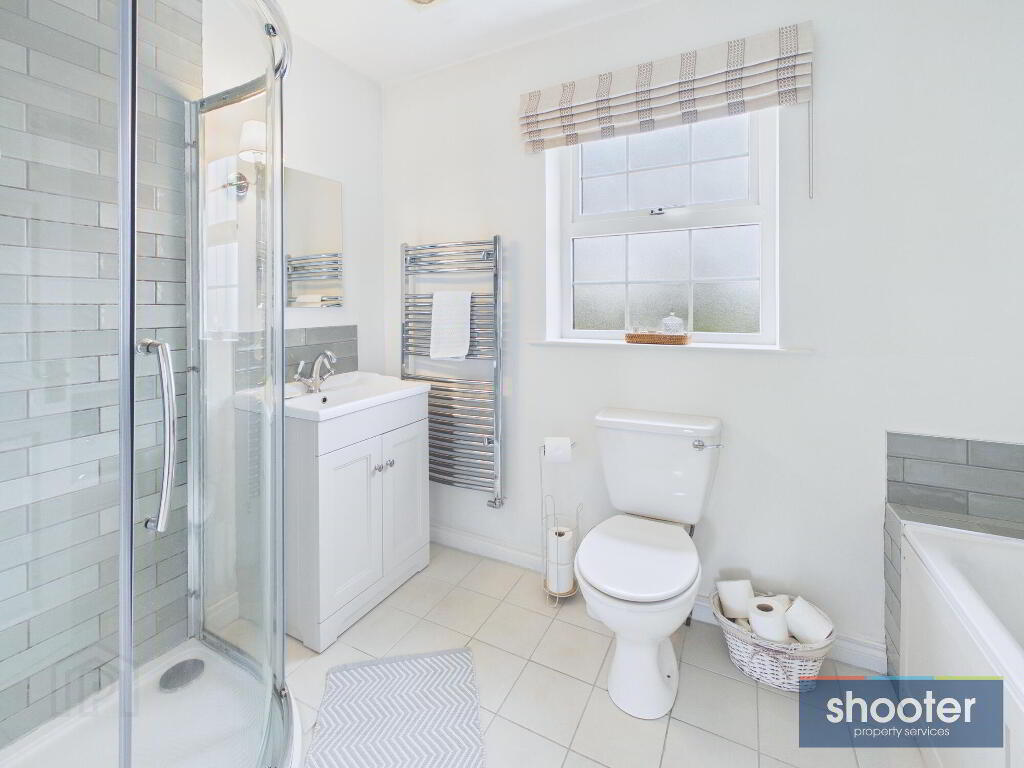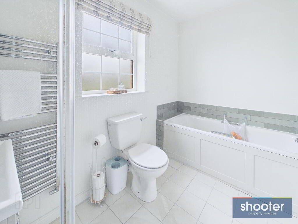 Toilet, vanity wash hand basin, bath and shower. Wall light, heated towel rail and extractor fan. Part tiled walls and ceramic tiled railings.