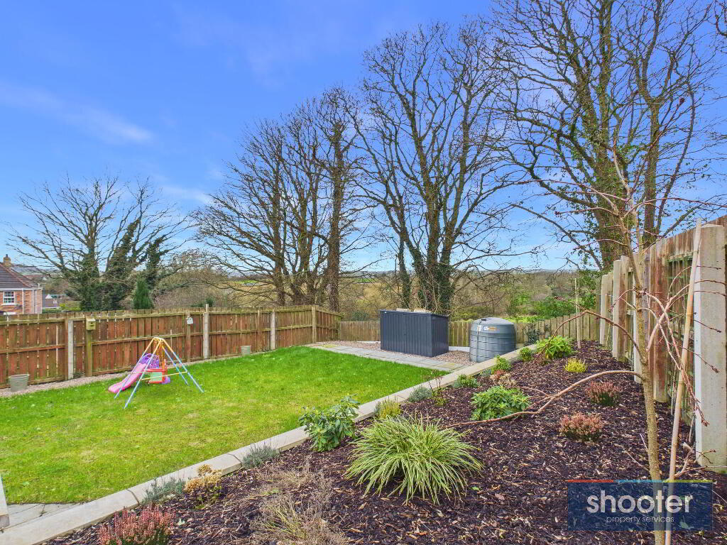 Tarmacadam driveway with parking to side. Neat grass lawn to front. Stepped up entrance with cast iron railings and wall lights. Fully enclosed rear garden with gated entrance. Paved patio area with large flat grass lawn. Paved path and decorative stone beds. Stepped up patio area with garden shed. Large decorative flower bed with an array of plants and shrubs.