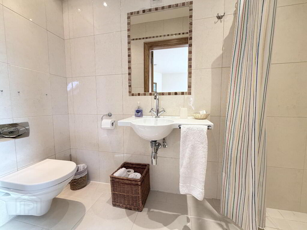 With close coupled WC, wall mounted wash hand basin and thermostatic mixer shower, fully tiled walls and floor, fully tiled walls and floor, recessed ceiling spots.