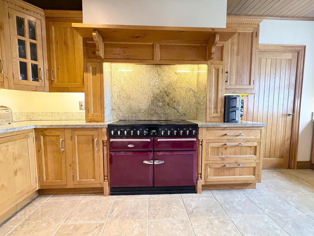 Full range of high and low level fitted inset oak units with granite worktops and upstands incorporating 1 1/2 bowl stainless steel sink unit and Quooker hot water tap, Window pelmet and glazed display unit, matching island unit with 1 3/4 bowl stainless steel sink unit and mixer tap. Stanley electric range with induction hob, surround, extractor hood and downlighting, housing for American style fridge/freezer with wine rack, fully integrated dishwasher and concealed microwave space. Worktop lighting, fully tiled floor, oak panelled ceiling with recessed ceiling spots, walk-in shelved pantry with light, open plan to…