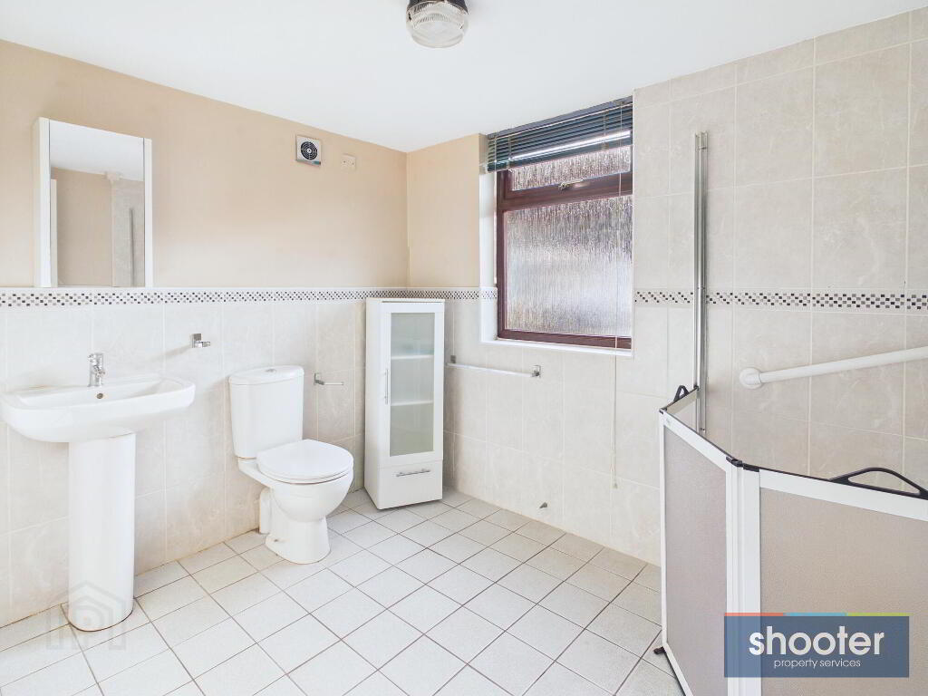 - Toilet, pedestal wash hand basin, bath with shower screen and Mira electric shower unit. Extractor fan and vanity unit. Hotpress off. Vinyl floor and tiled walls.