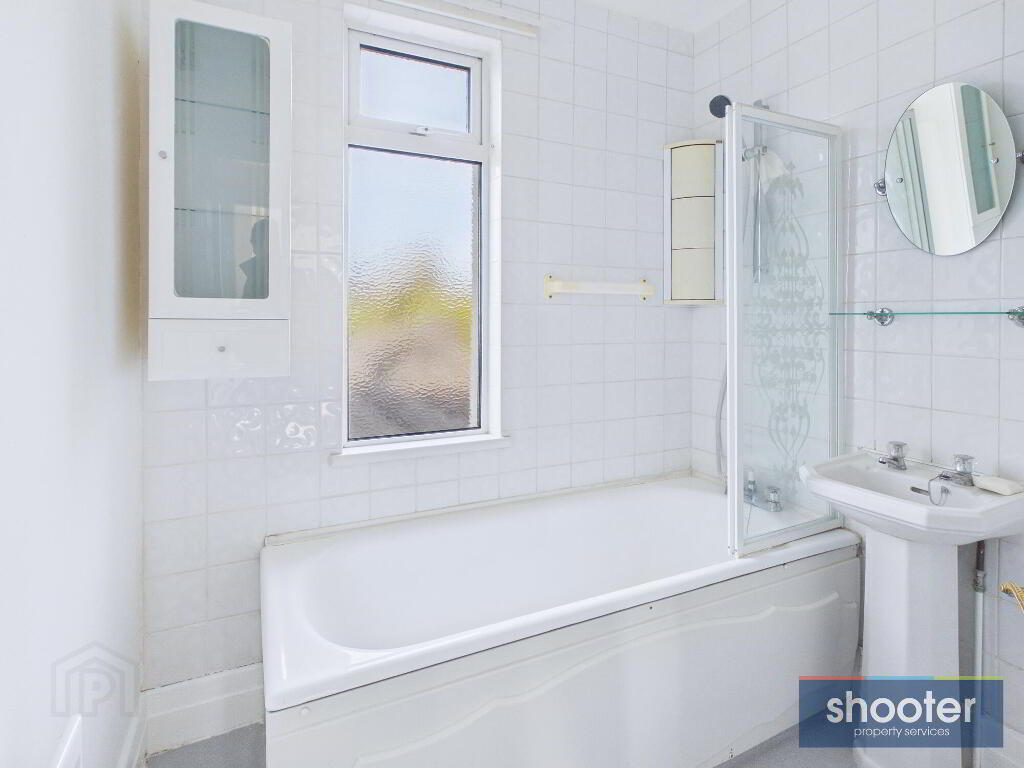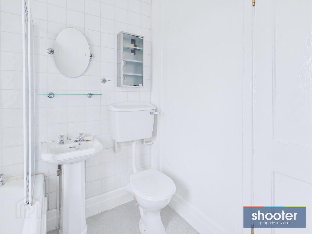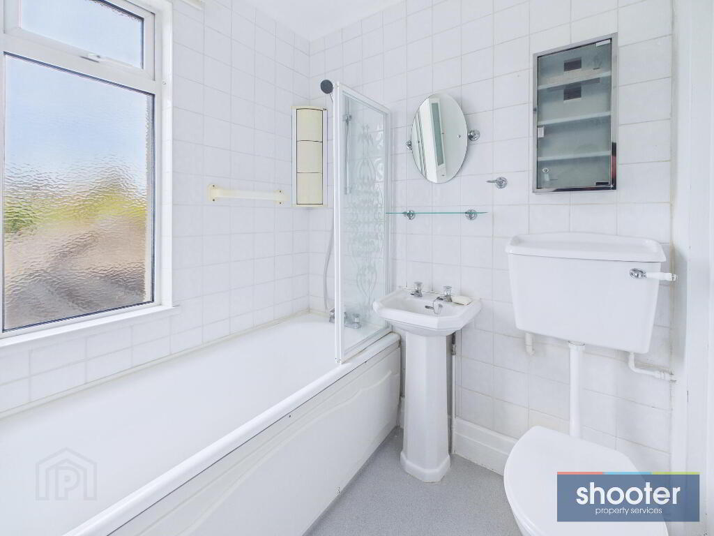 - Toilet, pedestal wash hand basin, bath with shower screen and shower attachment. Mirror and vanity units. Ceramic tile floor and part tiled walls.