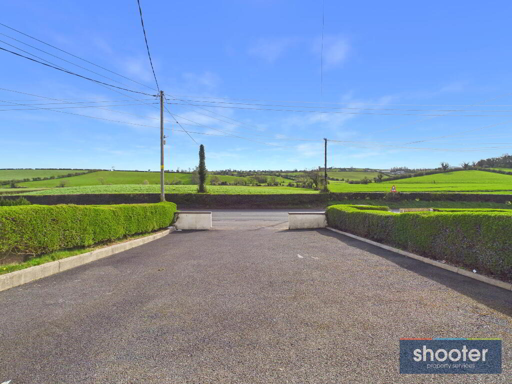 - Concrete wall entrance with large tarmacadam driveway and parking to the front. Small grass lawn and decorative stone bed. Outside light, watertap and post box. Concrete path around house. Raised rear garden. Huge grass lawn. Garden shed and clothesline.