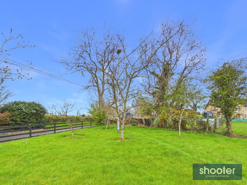 Concrete pillar entrance with wooden gate and fence boundary. Large tarmacadam driveway with parking to front, side and rear. Paved porch entrance with light and large grass lawn to front. Large grass paddock to the side. Concrete rear patio with outside light, water tap and washing line. Large grass lawn with paved patio area and fenced off planting area.