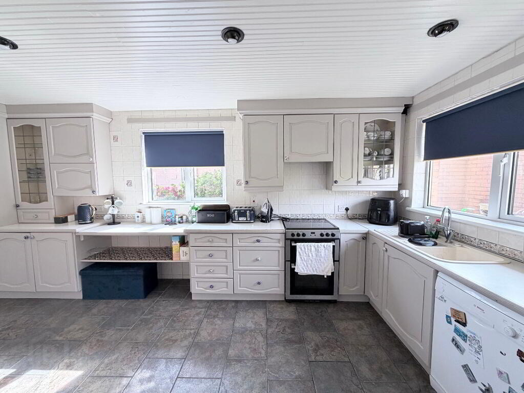 Range of fitted high and low level units with 1 1/2 bowl sink unit, cooker space with extractor hood, built-in fridge/freezer, plumbed for dishwasher, tiled walls, tiled floor, tongue and groove panelled ceiling with spot lights, understairs storage cupboard, PVC double glazed back door, double radiator.