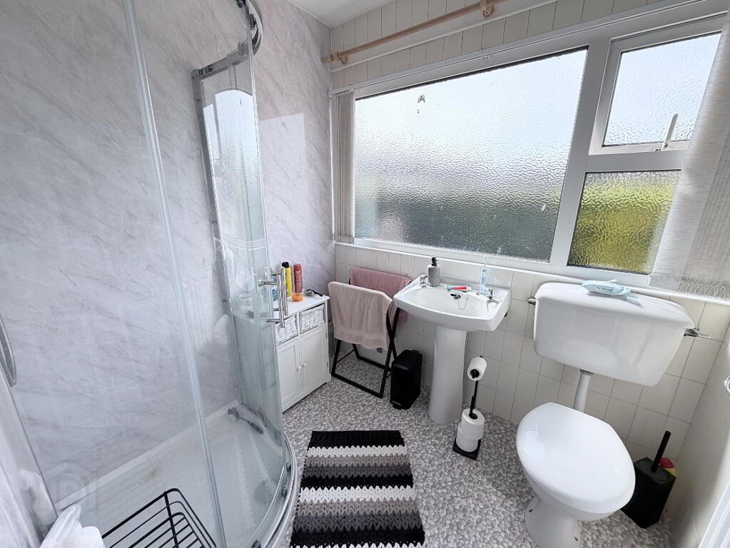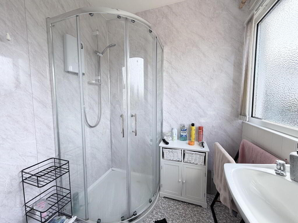 White suite comprising low flush WC, pedestal wash hand basin and quadrant shower cubicle with Mira Sport electric shower unit, part PVC wall panelling and part wall tiling, 1 radiator.